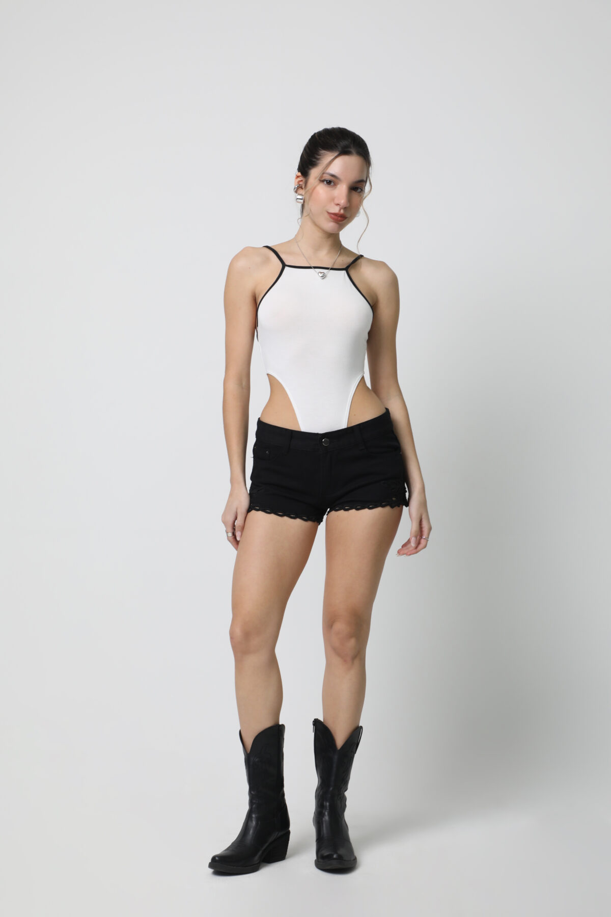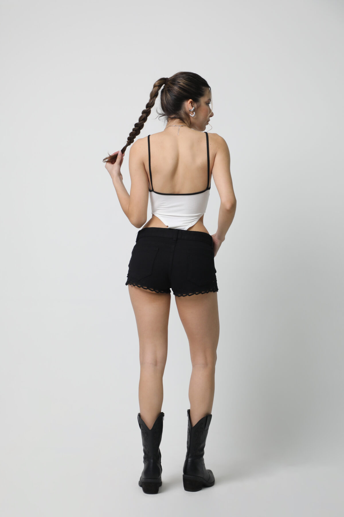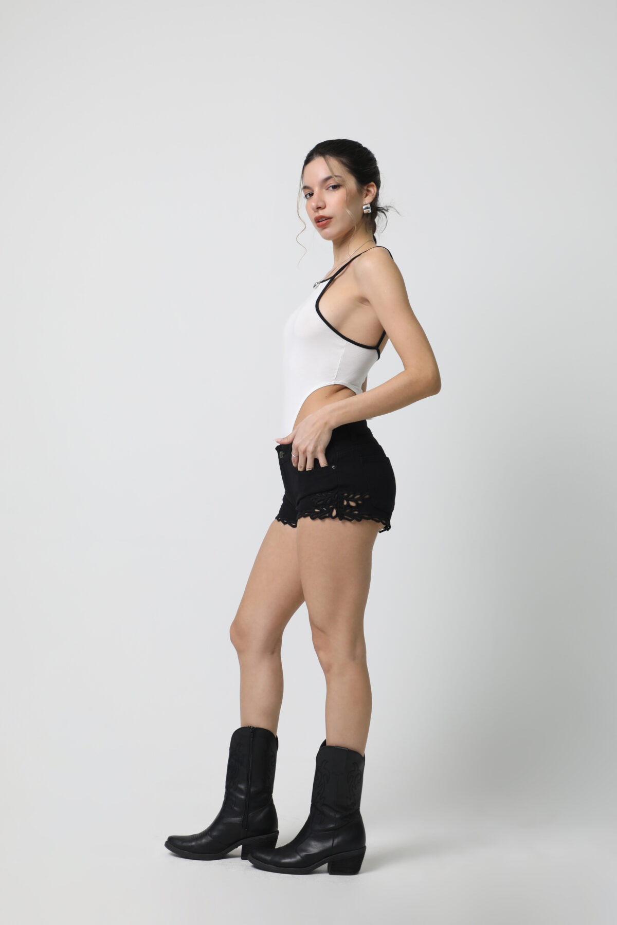 SHORT TIRO BAJO RIGIDO NEGRO CON DETALLE EN BRODERI